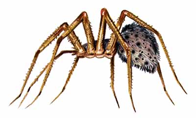 Has bulbous, yellow-brown abdomen. Common indoors.