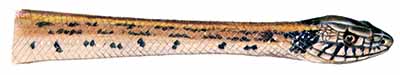 Olive to brown snake with two prominent black neck blotches and a yellow to orange back stripe.