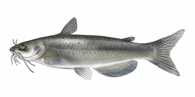 Olive to blue-gray fish is distinguished by its prominent mouth ‘whiskers’ (barbels) and dark spots scattered on its back and sides.