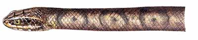 Large water snake with a spade-shaped head. Edges of mouth are tan. Young snakes are usually banded; older individuals are blotchy black and/or brownish.