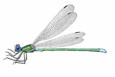 Body is bright metallic green. Abdomen is blue-tipped. Eyes and face are blue. Perches obliquely.
