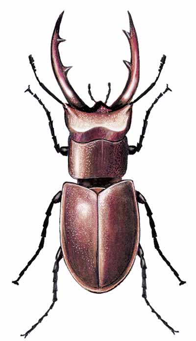 Large beetle has huge antler-like jaws and clubbed antennae.