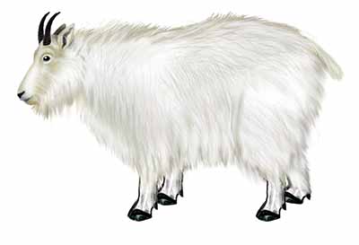 Distinguished by its long, shaggy white coat and black, dagger-like horns.