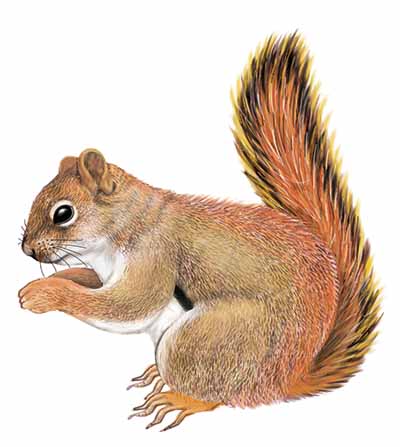Rusty-olive squirrel has a whitish belly and under-parts. Bushy tail is orangish.