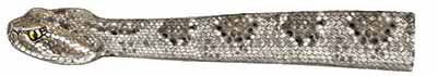 A thick-bodied grayish snake with brown diamond-like blotches down its back. Also has distinct black-and-white bands on its tail preceding the rattle.