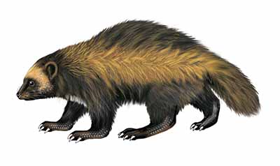 Stout and bear-like, it has a long brown to black coat with broad light stripes on either side.